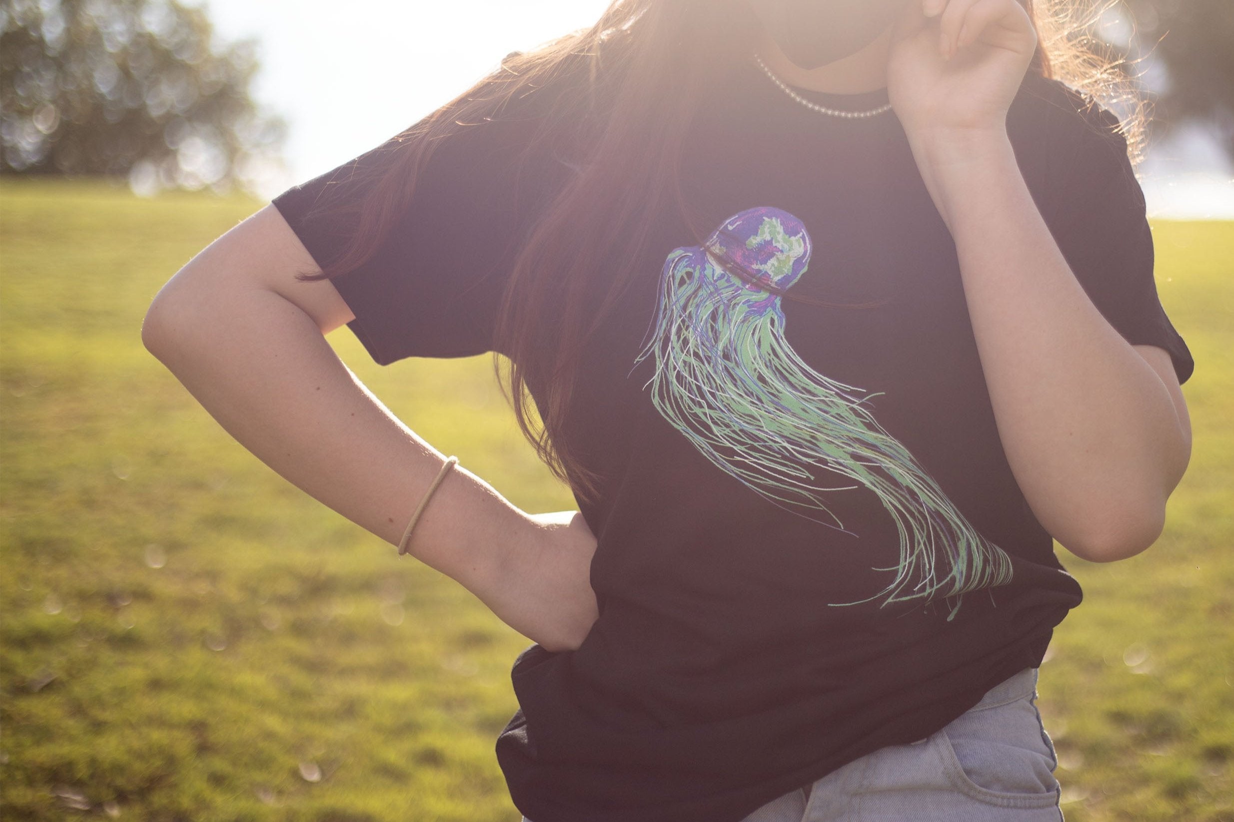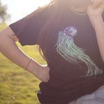 Our radiant BOX JELLYFISH glides effortlessly across this tee, hand-sketched with metallic markers and saturated in photoshop to capture the iridescent essence of jellyfish and water.