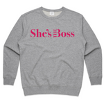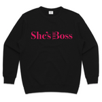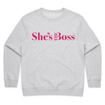 Our famous sweater is back featuring the She's The Boss logo.
