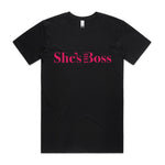 A comfy, loose unisex tee with the bold pink She's the Boss logo.